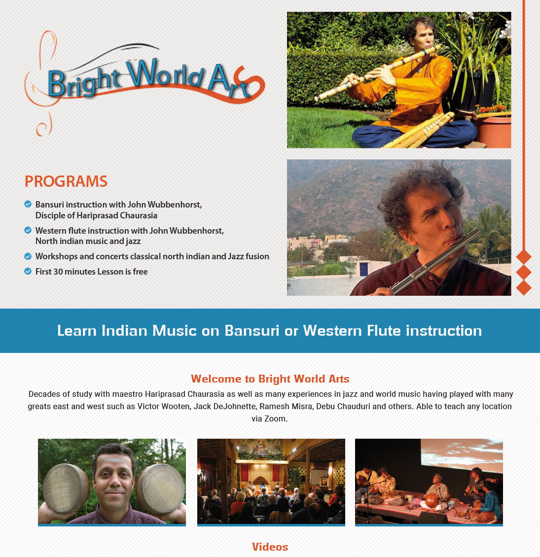 TRY IT OUT, FIRST LESSON IS FREE TO MAKE SURE YOU ARE HAPPY. Decades of study with maestro Hariprasad Chaurasia as well as many experiences in jazz and world music having played with many greats east and west such as Victor Wooten, Jack DeJohnette, Ramesh Misra, Debu Chauduri and others. Able to teach any location via Zoom. Western flute instruction also available with John (can play Indian melodies with western flute). Many wonderful experiences have happened since and I feel to be one of the luckiest people alive to have delved deep into music and met so many great souls. Some highlights were when I became associated with the bansuri (North Indian Bamboo flute) and met the marvelous master of the bansuri, Hariprasad Chaurasia. His sound and technique were so sublime and I was entranced. I longer could stay away and moved to India for 2 years where I met Hariprasad and he agreed to teach me! This was beyond joyful for me. The organic, healing sound of the bansuri was a healing force and I felt Indian music with this instrument held me in the heart. I followed Hariprasad to the Rotterdam Conservatorium for 12 years of study there (I commuted to Holland 3-5 times a year from Washington DC). I earned 2 degrees in World music there. Simultaneous to this musical journey I continued to study the spiritual traditions (mainly from India) and felt very close to the teaching and presence of Swami Muktananda, Ramana Maharshi, Swami Vivekananda, Ramakrishna, and others. One day a musician friend returned from a spiritual retreat with the spiritual master Adi Da Samraj and I picked him up from the airport. Right away I felt a transmission from this friend of mine. I knew immediately this was from Adi Da. A spiritual current descended on me and in a few weeks, I was given the opportunity to play for Adi Da and was overwhelmed from a tangible spiritual force from Adi Da. It was great to find out Adi Da was deeply into music and Hariprasad was one of his favorite musicians!