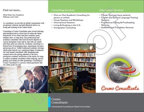 Cosmo Consultants focuses special attention on providing professional services for global college-level students coming to study and live in the United States. The unique position of Cosmo Consultants stems from the fact that it actually helps not just in one aspect of a student's life, but in all aspects of his or her academic career. As having very long experience living as international students in the United States who also lived through similar circumstances as incoming individuals, our team of experts can offer tailored advice about all aspects of academia. Apart from consulting, we offer other solutions and services for our global communities. Some of these services are offered in the form of packages that clients can purchase and renew on annual or semi-annual basis. Part of our most popular services include one-on-one consulting, translation services, and private tutoring. This service-diversification allows Cosmo Consultants to better serve our diverse communities and accommodate their various individual needs.