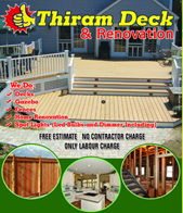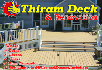 Thiram Deck & Renovation offers Decks, Gazebo, Fences, Home Renovation, Spot Lights (Led Bulbs and Dimmer, Including). Free Estimate, No Contractor Charge and Only Labour Charge. For more information please contact us via phone or email.