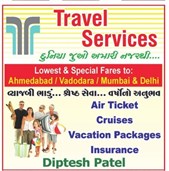 Travel Services Inc. is available in Brampton, ON. We provide lowest and special fares to: Ahmedabad / Vadodara / Mumbai & delhi. We provide services for Air tickets, cruises, vacation packages and insurance. For more details contact us.
