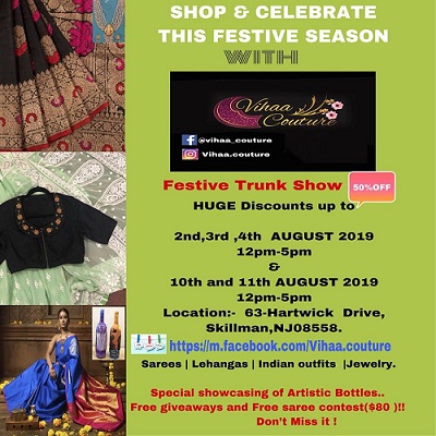 Vihaa Couture for Indian Ethnic Wear, Designer Suits, Dresses, and Kurtis Outfits in different style, colors and sizes and many more. Nobody will be upset with our price guaranteed lowest in the entire Area because we have our own production plant in India. Your visit is our business strength. Come on in and take a look around! Our helpful staff will be happy to assist you. It’s the perfect place to find the “unexpected. For more details kindly contact us. Vihaa Couture is an Indian wardrobe boutique. Welcome to an exclusive destination of Ethnic Designer outfits for the Modern Indian Woman. Experience Authentic Indian Ethnic wear in Classic traditional and contemporary drapes..... Please visit us on Facebook/ Instagram. Festive season is a season of happiness and celebration and brings along with it reasons to indulge into shopping! Navratri outfits, ethnic wear, jewelry, Diwali outfit, Festive gifts and more at this event. Experience Authentic Indian Ethnic wear in Classic traditional and contemporary drapes....